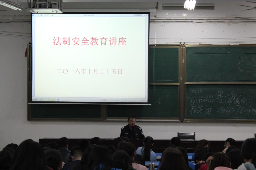 为提高新生的法制观念,树立良好的安全防范意识,有效地保护好自己的人身和财产安全,保卫处分别于10月17日、20日、25日,在1号教学楼多媒体1111教室组织2016级新生进行法制安全教育专题讲座。我院特邀洞山派出所有着从警30余年的秦晋副所长为2016级新生作了3场精彩的法制安全教育讲座。