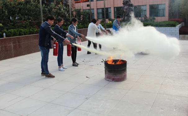 疏散演练结束后,在4号教学楼广场进行了器材灭火演练,学院专职消防人员向师生演示了灭火步骤。在现场,师生们亲自手握灭火器,在消防专职人员和保卫人员的指导下,按步骤要领,对熊熊火焰进行了扑灭演练。